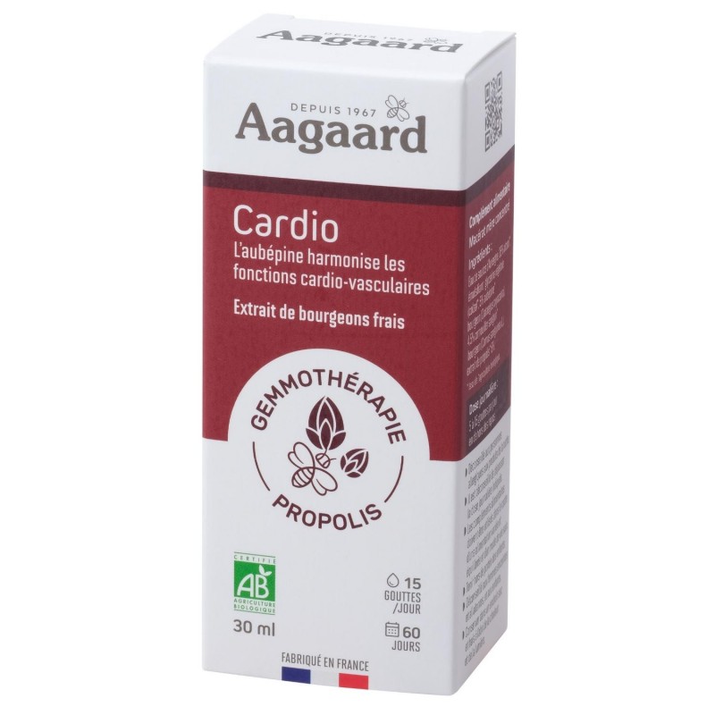 Eau de source d’Auvergne, 35% alcool*, émulsifiant : glycérine végétale (colza)*, 5% aubépine* bourgeon (Crataegus oxyacanta), 4,5% cornouiller sanguin* bourgeon (Cornus sanguinea L.), extrait de propolis* 5%.